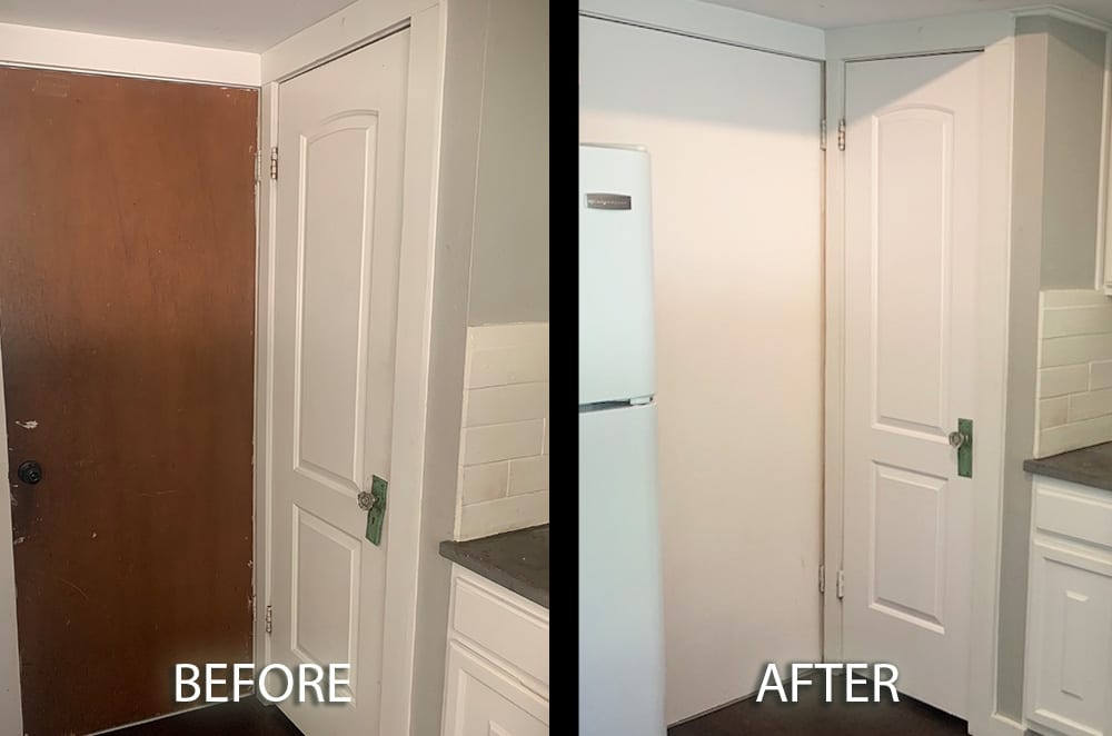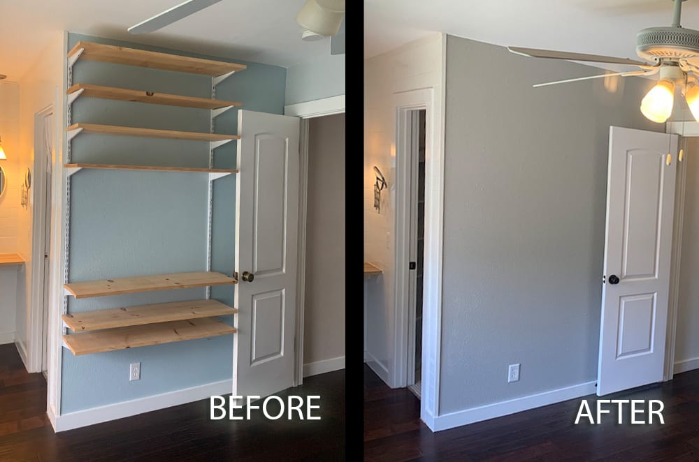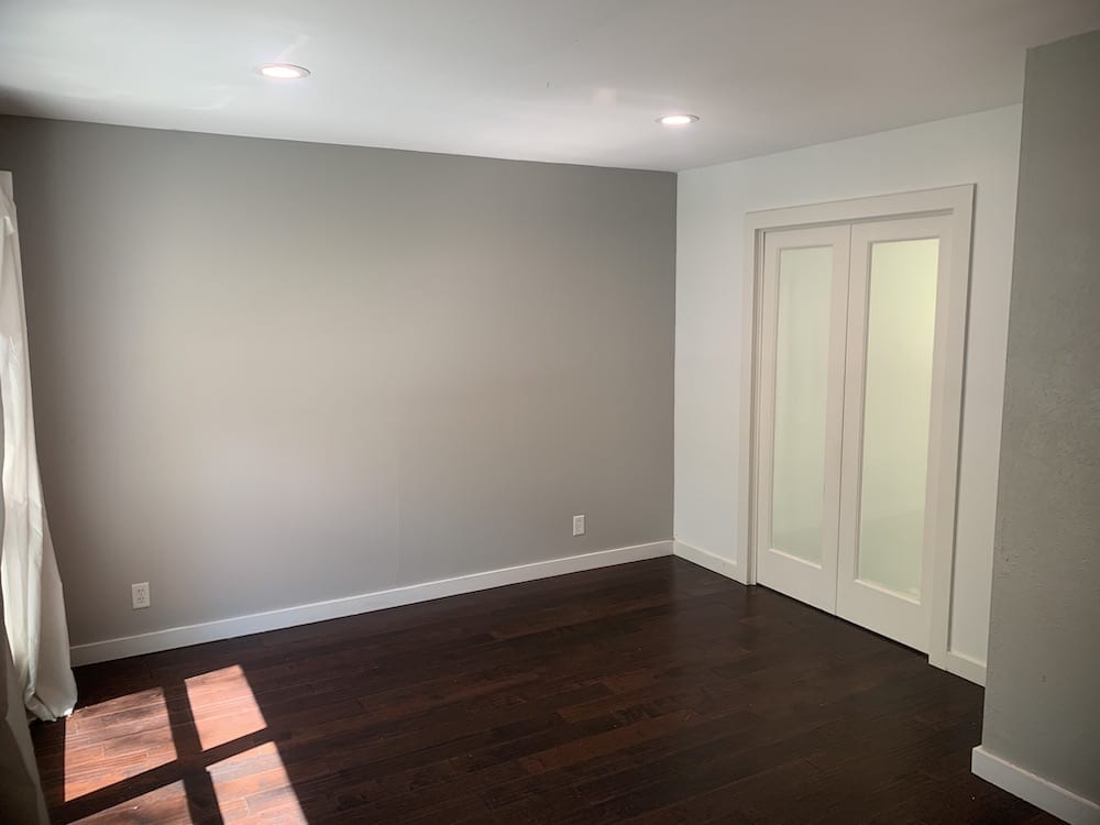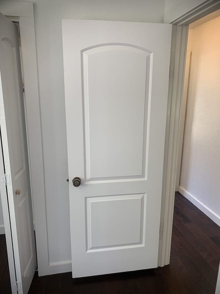 Another completed project! The gray interior paint on this one looked great with the white trim and other colors in the house. The beige hallway was painted in a more modern white. We also installed arch-top closet folding doors and sprayed all the doors throughout, leaving this house looking fresh and new.