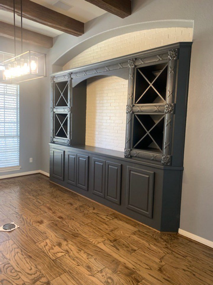 These cabinets were re-done with a professional spray finish… a much more modern look! Check out the before and after photos. The prep photos shows the cabinets masked and ready for painting after prep and priming has been completed. The end result looks outstanding!